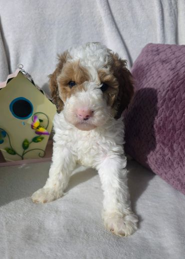 SARA: Sara is our Medium Goldendoodle female. She is a lovely Cream w/white tuxedo color. As predicted she has produced many gorgeous colors from parti, to tri-colored, phantom, and sable. Sara is such a sweetheart with the sweetest temperament. These puppies are spectacular! Ready to go May 2nd!