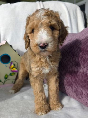 Our puppies are all raised in our home, socialized well to people, noise, other dogs, cats and also are fully trained to their crate for bedtime and during the day separately but next to each other so the puppies learn independence while feeling safely next to siblings. Will go home well socialized, handled from birth, vetted, vacc., properly weaned fully from mom, and fully crate trained, as in will sleep overnight and can spend time alone as well*. These puppies will go to their new homes confident and well adjusted making the transition a smooth one. Parents are fully health screened, mom is an F2b medium Goldendoodle & dad is a medium Standard Poodle. These are 4th generation puppies. Puppies will be multi-generational with a Teddy bear look!